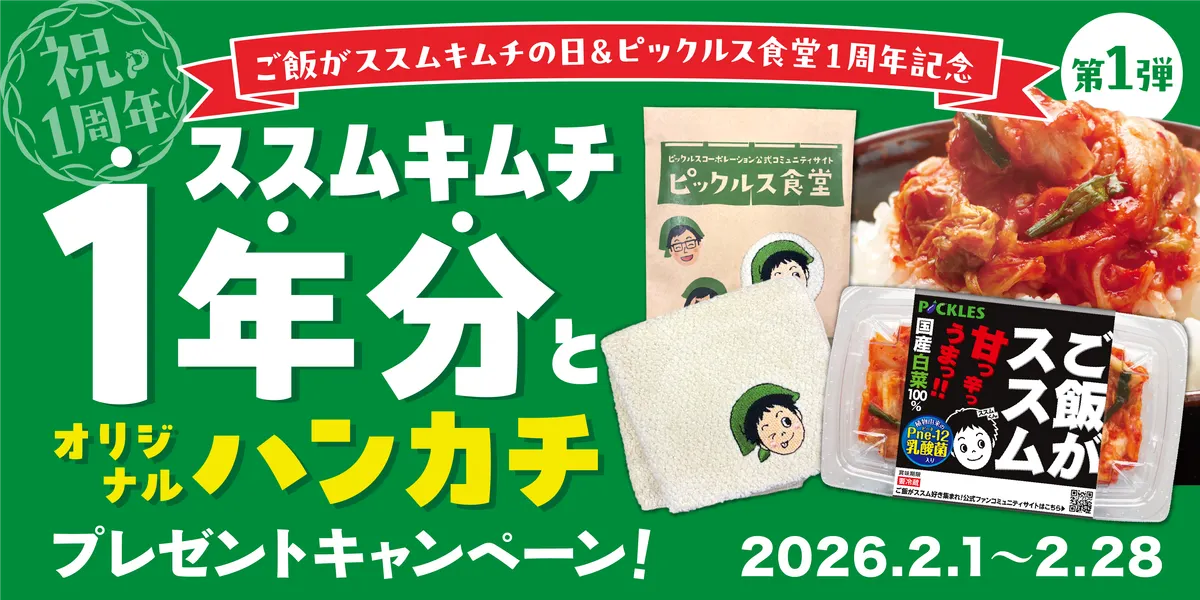 第1弾の2月は「キムチ1年分&オリジナルハンカチプレゼントキャンペーン」🌶️