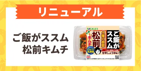 リニューアルでさらにおいしく♪「ご飯がススム松前キムチ」 「ご飯がススム松前キムチ」がリニューアルして9月より新登場!好評の甘じょっぱさはそのままに、さらにおいしく生まれ変わりました😆✨✅大根の味付をブラッシュアップ、絶妙な甘辛さになってよりご飯がススム味わいに!✅昆布とスルメ、4種根菜の配合バランスを見直し。より具材との一体感のアップ♪✅パッケージ側面の