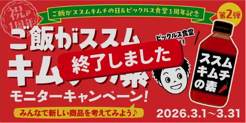 ※キャンペーンは終了しました「社員」の皆さま、お疲れ様です🙇2月26日は(ススム)でご飯がススムキムチの日🍚日頃の感謝を込めて、2月・3月は2か月連続で特別なキャンペーンを実施します🙌第2弾の3月は「ご飯がススムキムチの素モニターキャンペーン」🌶️ご飯がススムキムチに使用されているタレである「ヤンニ