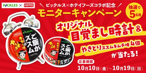 【ピックルス×ホテイフーズコラボ記念】モニターキャンペーン #ご飯がススムキムチ味やきとり」を付けて「献立表」「相席テーブル」いずれかへ投稿していただける方・やきとりが大好きな方▽商品・当選人数「特製目覚まし時計⏰」×1「ご飯がススムキムチ味やきとり🐔」×4「ピックルス食堂オリジナルパッケージのお米」×1を抽選で5名様にプレゼント🎁※注意事項※・内容は告知な