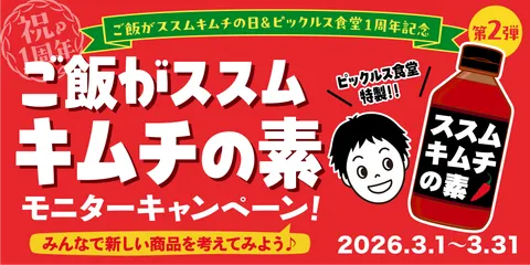 NEW 【ススムの日&食堂1周年記念】第2弾 ご飯がススムキムチの「素」モニターキャンペーン #ご飯がススムキムチ新商品企画案」を付けて「献立表」へ写真付きで投稿していただける方・ススムくんを一緒にお祝いしてくれる方・新たなススムくんの可能性を発見したい方 ▽賞品・当選人ご飯がススムキムチの素(ヤンニョム・食堂オリジナルブレンド)を抽選で10名様にプレゼント🎁※バナーの